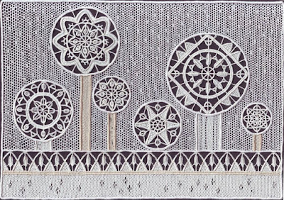 Některé historické krajky jsou částečně šité ve více vrstvách. Většinou to bývají různé kytičky nebo jiné rostlinné motivy. Typickým příkladem je květina s vystouplým obkroužkovaným středem, jehož okraje jsou zdobeny více nebo méně komplikovaným obloučkovým vzorem. Pokud je tento vzor jednoduchý, tvořený například řadou jednoduchých obloučků, není problém je ušít bez jakékoliv podložky s nákresem jen pomocí špendlíku. Větším problémem ale mohou být složitější vzory. Nepochybuji o tom, že staří mistři byli schopni i tuto svrchní část krajky ušít zpaměti a bez podložky.